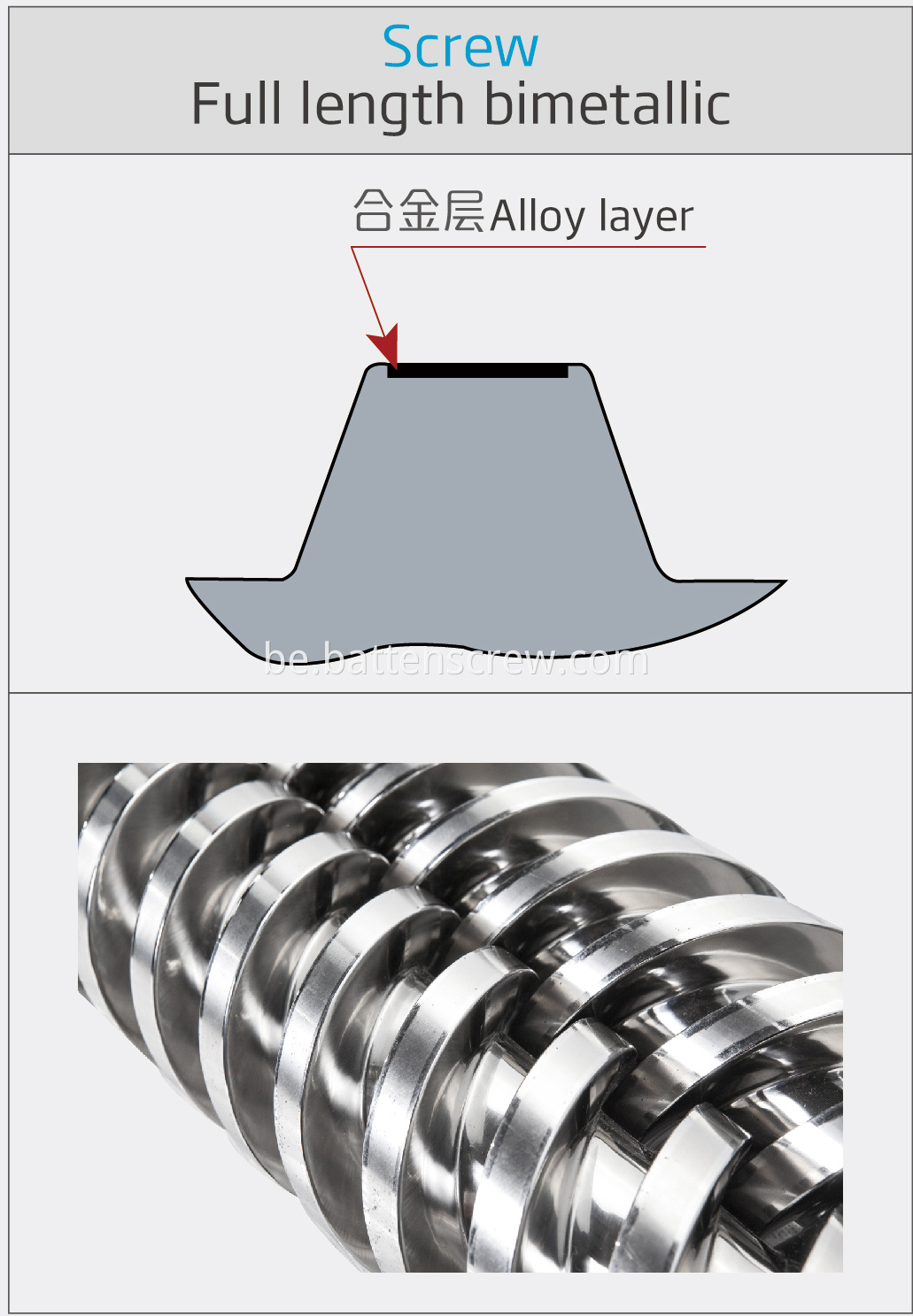 Process:Advanced nitriding & bimetallic process Hardness After Hardening & Tempering:HB280-320 Nitrided Hardness:HV900-1000 Nitrided Case Depth:0.45-0.8mm Nitrided Brittleness:Less than Grade 2 Surface Roughness:Ra 0.4 Screw Straightness:0.015mm Alloy Hardness:HRC 50-65 Alloy Depth:0.8-2.0mm |
