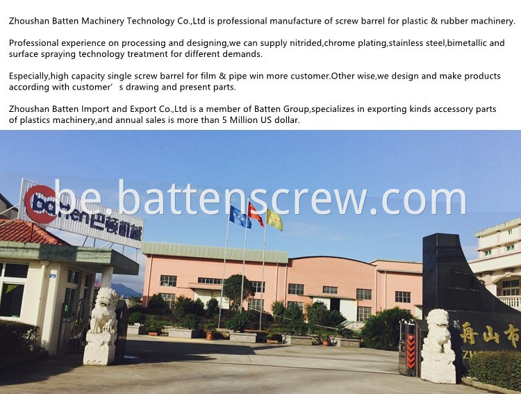 1. Якая інфармацыя павінна быць прадастаўлена пры запыце кошту шрубы і бочкі? A.CONICAL /PARALLEL TWIN SCRIEN BARRAL - I.Extruder Brand II.Model. EG.Jwell 65/132, LSE80/156, KMD114/36, BEX90/22 і г.д. A.Gearbox Nameplate, калі машына зроблена ў Кітаі, толькі пастаўкі на шыльду з каробкай перадач, мы можам пацвердзіць малюнак вытворчасці. Лепш за ўсё паставіць: B.Connection Flance Памер або памеру злучэння бочкі C. ThermoCouple Адтуліны Размяшчэнне, Qty & Size D.Screw Connection Counting Памер: I. Шрубавы канец max.diameter ii. Нумар ключоў. E.Barrel звонку эскіз 3. Хто лепш для ПВХ -профілю? Біметалічны ці нітрынг? Мы прапануем выкарыстаць азоцірную шрубавую бочку для ПВХ -профілю, каб мець больш якасную гатовую прадукцыю. 4. Як выбраць шрубавую бочку для ін'екцыйных машын? Для новай/нявіннай пластыкавай сыравіны мы прапануем выкарыстоўваць нізовыя. Для матэрыялу са шкляным валакном менш за 15%~ 30%мы прапануем зрабіць біметалічны шруба і ствол. Для матэрыялу са шкляным валакном больш за 30%мы прапануем зрабіць вальфраму біметалічны шруба і ствол. 5. Як пра гарантыю шрубавай бочкі? І час жыцця? Наша звычайная гарантыя - праз год пасля даты адмовы. Час залежыць ад сапраўднага сырога пластыкавага матэрыялу. Час жыцця складае каля 3 ~ 5 гадоў для экструдэра з адной шрубавай бочкай і каля 20 000 працоўных гадзін для матэрыялу ПВХ. У асноўным, залежыць ад сапраўднага сырога пластыкавага матэрыялу. 6. Як даць добры сэрвіс? Нашы інжынеры даступныя для абслугоўвання машын за мяжой. Мы абяцаем, што любая праблема якаснай ад Батэна, мы нясем вялікую адказнасць за вырашэнне кліентаў. Пасля атрымання вашага запыту ці пытання, нашы продажу звяжацца з вамі на працягу 24 гадзін. Кожны шрубавы ствол будзе агледжаны двойчы перад дастаўкай. Першы агляд праходзіць перад нізовам, другі раз пасля азоціру. 7. Якая сырая сталёвая латэн выкарыстоўваецца для вырабу шрубавай бочкі? Мы выбіраем Shanghai Bao Steel і Fushun Special Steel. Гэтыя пастаўшчыкі сталі - 10 лепшых вытворцаў у Кітаі. 8. Ці ёсць завод альбо гандлёвая кампанія? Zhoushan Batten Machinery Technology Co., Ltd - гэта прафесійнае выраб шрубавай бочкі для пластыкавай і гумовай тэхнікі. У нас ёсць заводская плошча 3000 м2 для атрымання шрубавых бочак.
