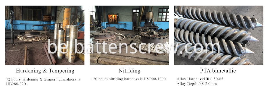 Process:Advanced nitriding & bimetallic processHardness After Hardening & Tempering:HB280-320 Nitrided Hardness:HV900-1000 Nitrided Case Depth:0.45-0.8mm Nitrided Brittleness:Less than Grade 2 Surface Roughness:Ra 0.4 Screw Straightness:0.015mm Alloy Hardness:HRC 50-65 Alloy Depth:0.8-2.0mm thickenss After Chrome:0.05-0.10mm chrome Hardness:Not less than 950HV |