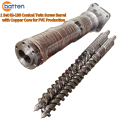 Гэты прадукт уяўляе сабой набор канічных двухшрубавых ствалоў 62-130, спецыяльна адаптаваных для сцэнарыяў вытворчасці ПВХ, з асноўнай асаблівасцю медзі, якая змяшчаецца ў структуры ствала. І шнек, і ствол выраблены з высакаякаснага сплаву ў спалучэнні з меднымі кампанентамі, што надае прадукту выдатную зносаўстойлівасць і каразійную ўстойлівасць, эфектыўна супрацьстаіць хімічнай эрозіі расплаўленых ПВХ-матэрыялаў і ізаляцыі сыравінных прымешак, пазбягаючы частай замены кампанентаў і значна павялічваючы тэрмін службы. Медзь, якая змяшчаецца ў ствале, аптымізуе цеплаправоднасць і кантроль тэмпературы абсталявання, забяспечвае хуткае і раўнамернае рассейванне цяпла падчас апрацоўкі ПВХ, прадухіляе дэградацыю матэрыялу, выкліканую мясцовым перагрэвам, і забяспечвае бяспеку і стабільнасць працы вытворчасці. Прыняўшы прафесійную канічную двайную структуру, ён адпавядае характарыстыкам пластыфікацыі матэрыялаў з ПВХ, паскарае хуткасць транспарціроўкі і плаўлення матэрыялаў, скарачае цыкл апрацоўкі, значна павышае эфектыўнасць вытворчасці і забяспечвае нязменную якасць гатовай прадукцыі з ПВХ. Прадукт мае выдатную структурную ўстойлівасць, можа стабільна працаваць пры працяглых працоўных умовах высокай нагрузкі без дэфармацыі або адмовы, ліквідуе патэнцыйныя небяспекі вытворчасці і з'яўляецца ідэальным асноўным кампанентам для эфектыўнай і стабільнай вытворчасці ПВХ з яго шырокімі перавагамі бяспекі, даўгавечнасці і высокай эфектыўнасці.
